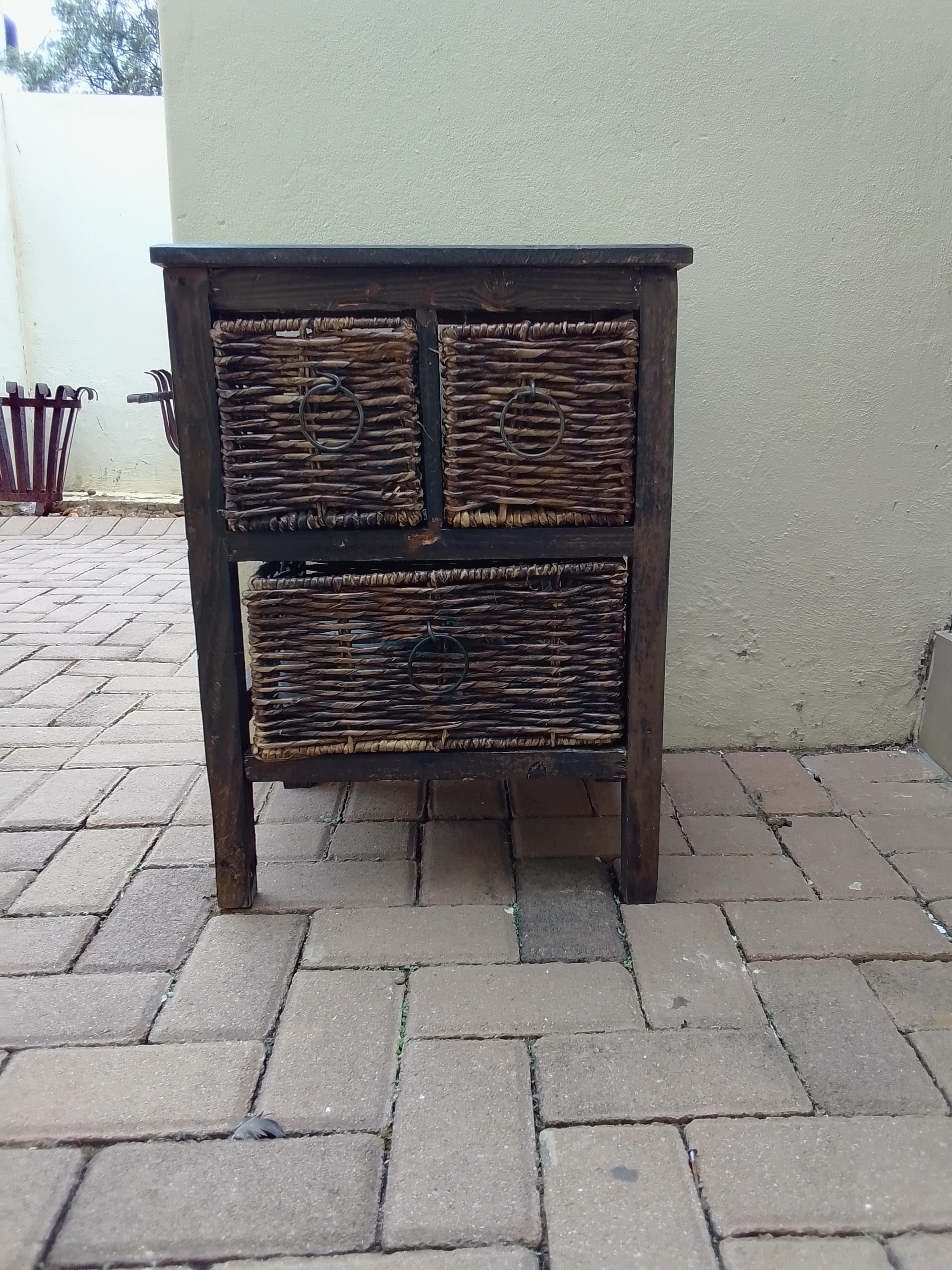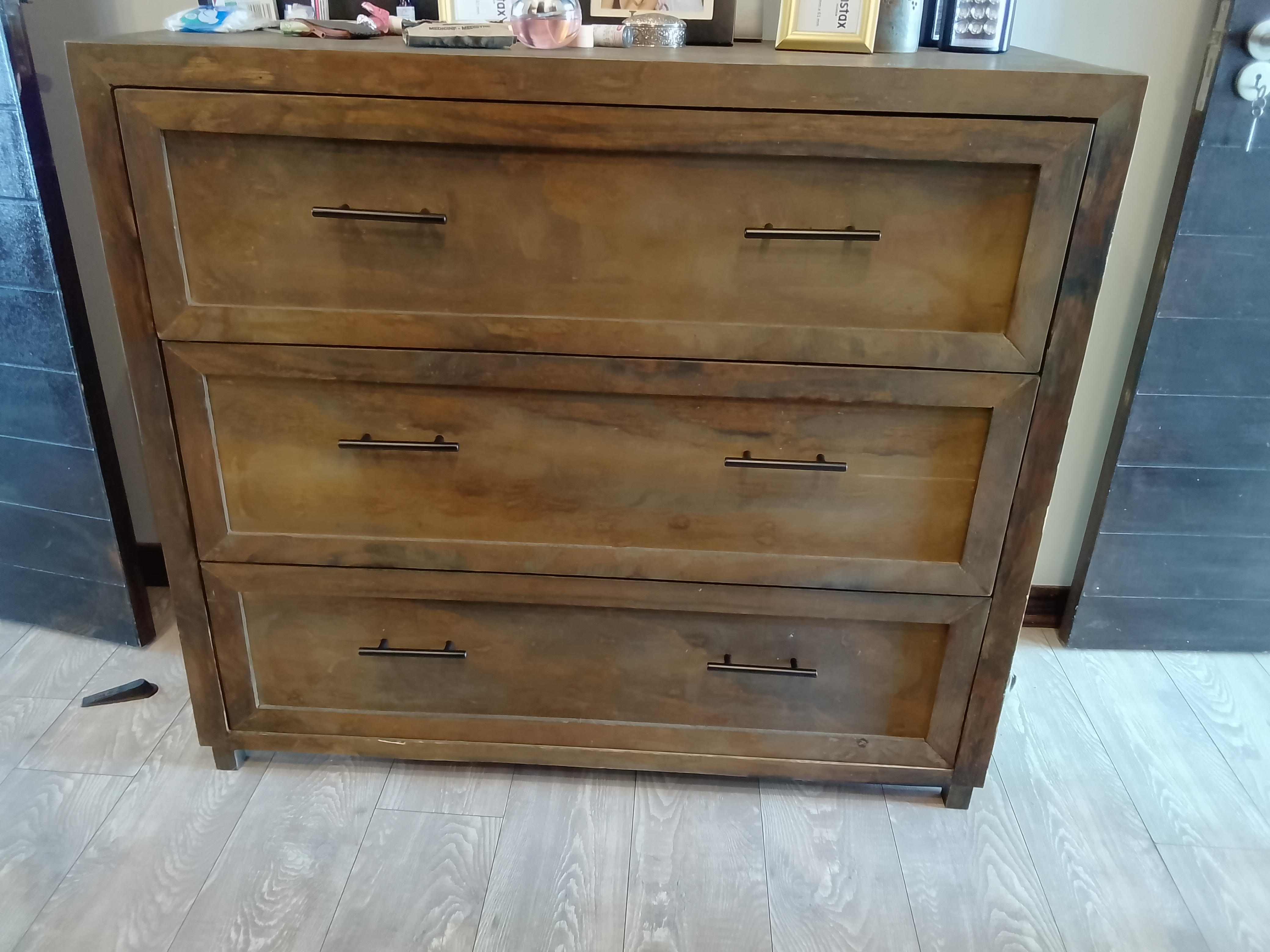 Three-drawer wooden or dresser with a rustic design.