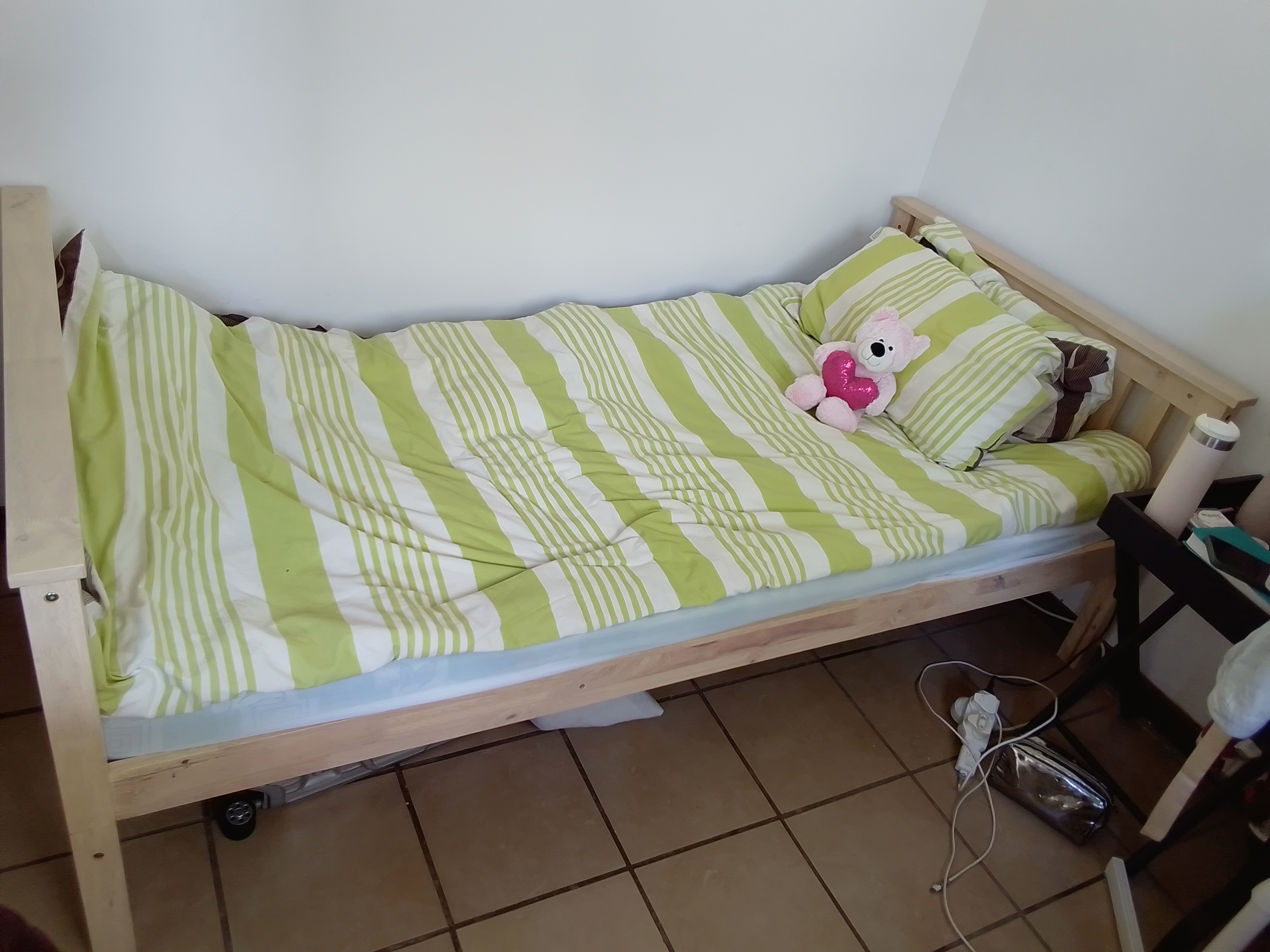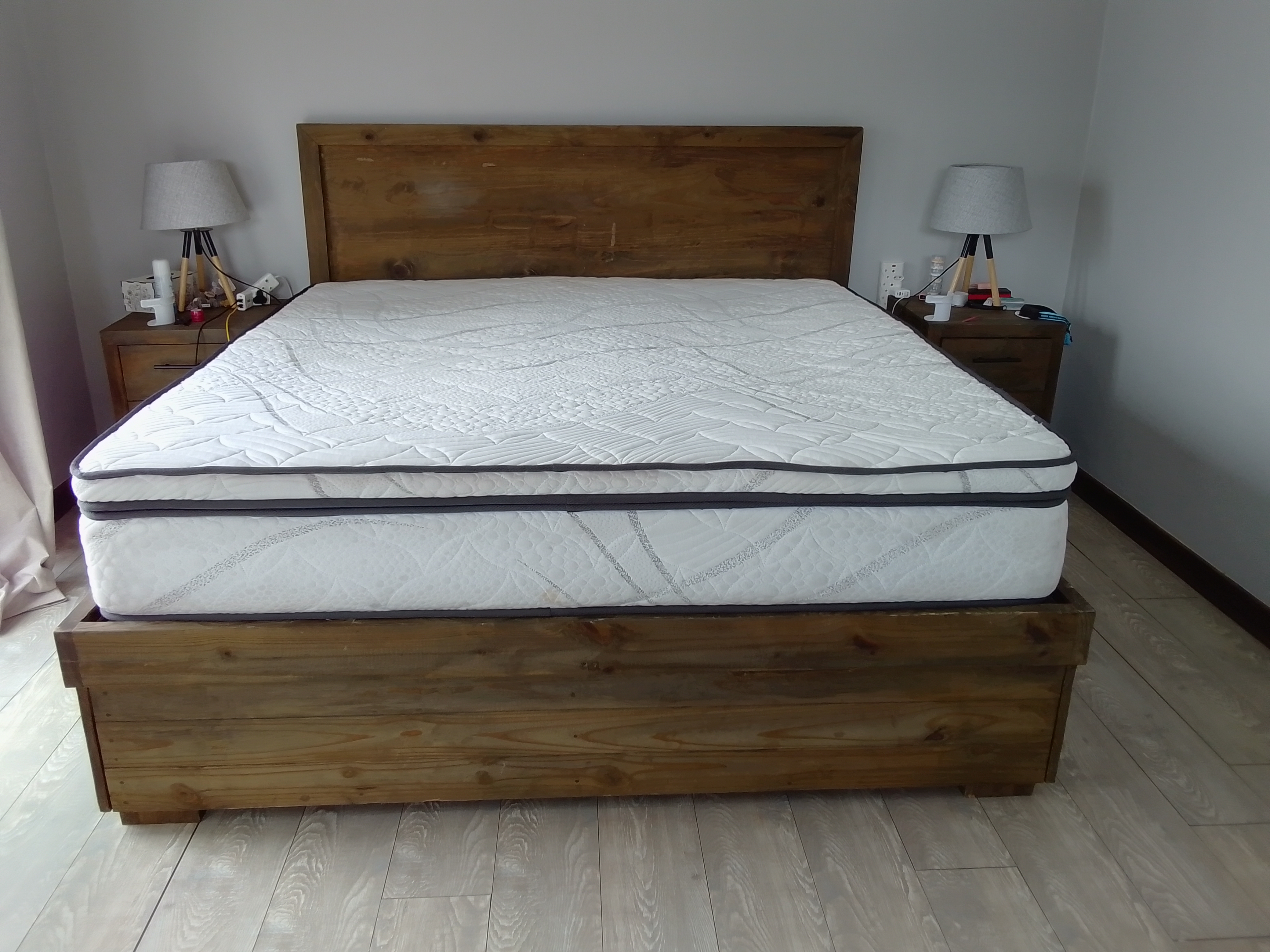 Rustic Wooden Bed Frame, Mattress, and Matching Bedside Tables